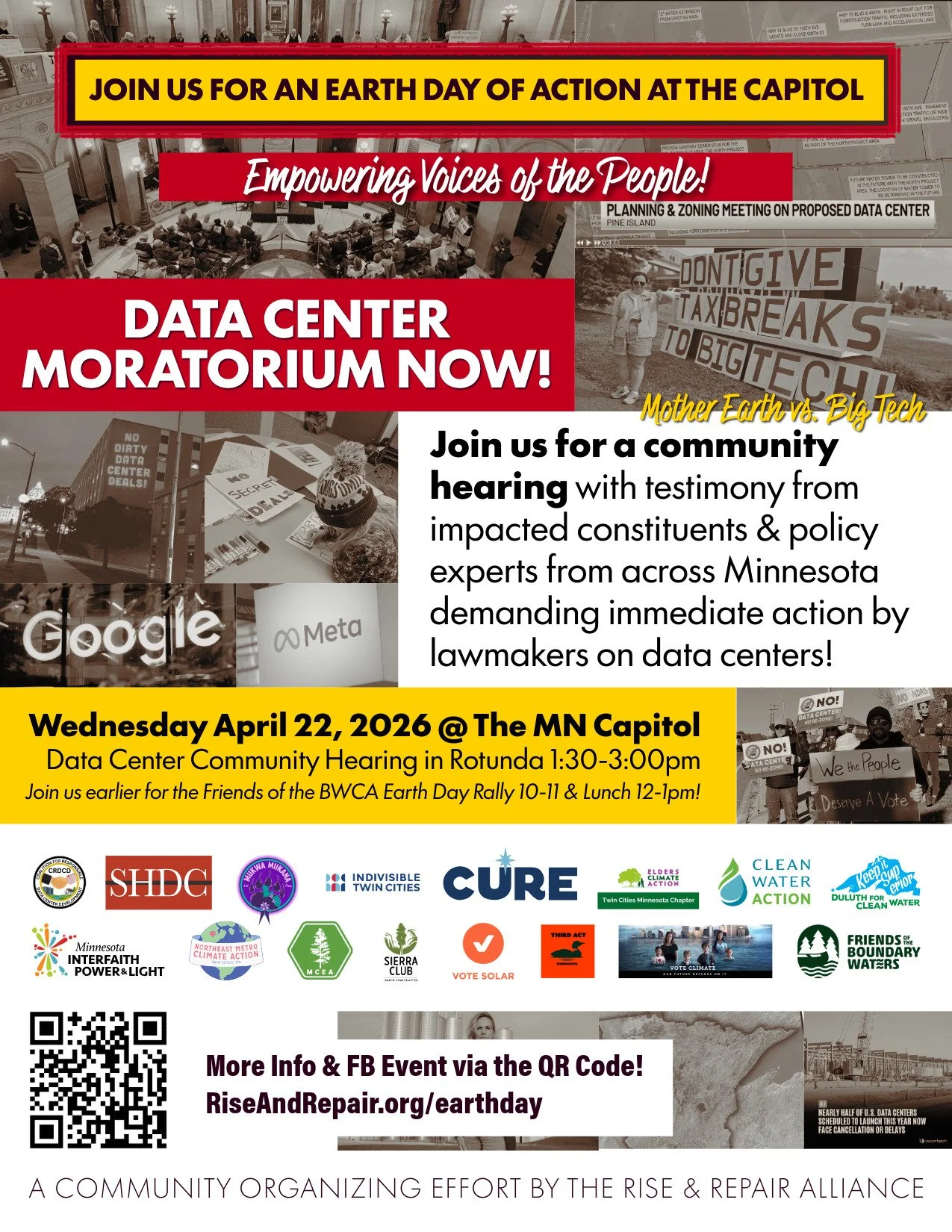 Join us in the MN Capitol Rotunda on Earth Day, April 22nd, from 1:30-3pm for a Community Hearing on Data Centers!