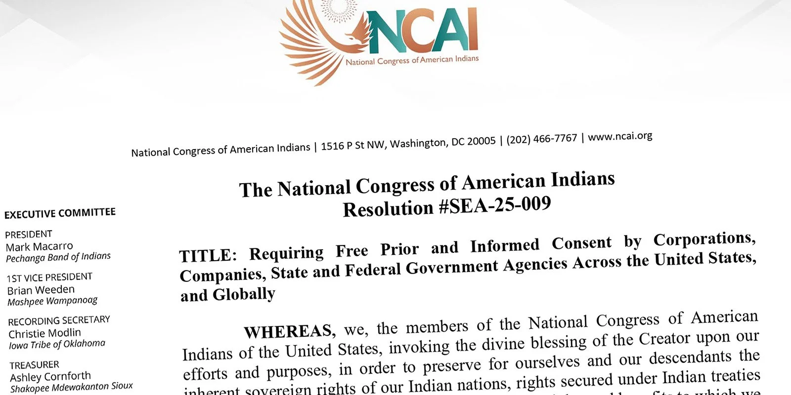 The General Assembly at the 2025 Annual Convention of the National Congress of American Indians adopted a resolution supporting Free, Prior and Informed Consent , known as “FPIC”, and encourages this to be adopted by Corporations, Companies, State and Federal Government Agencies Across the United States, and Globally.